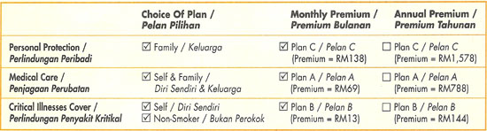Mr. Lee, a non-smoker aged 33, wants to purchase 2 plans, Personal Protection and Medical Care, for himself and his family. He also wants to obtain the Critical Illnesses Cover for himself. He chooses the following options: